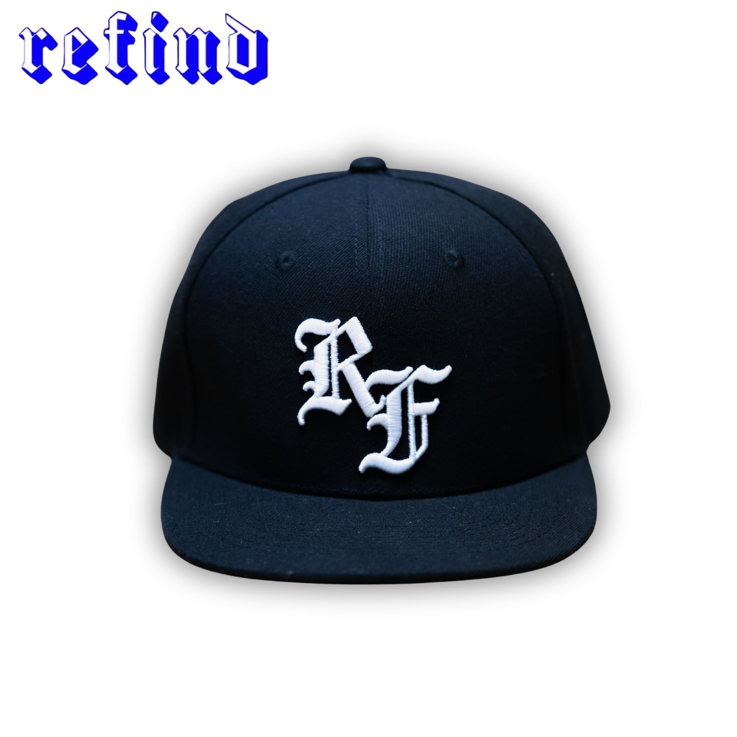 フロントにオリジナルrefindロゴの3D刺繍を配置したベースボールキャップ。